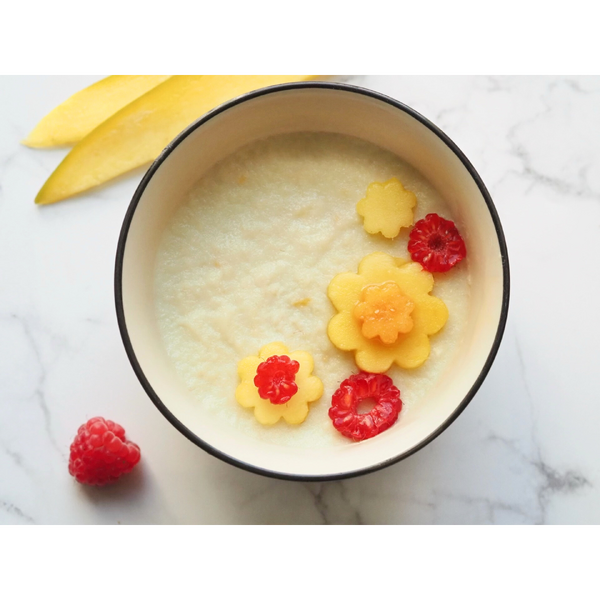 Instant Reisbrei 37 %, Kokosfett, getrockneter Glukosesirup, Inulin 6,4 %, native Maisstärke, Rohrzucker, Vitamin- und Mineralstoff-Premix, gefriergetrocknete Mango 2 %, natürlicher Melisse-Extrakt 0,43 % (Melisse, Maltodextrin), Salz, Emulgator: E472e (pflanzlichen Ursprungs), Stabilisator: E340, Aroma