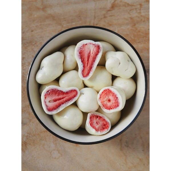 Die perfekte Kombination aus den Aromen von gefriergetrockneten Erdbeeren und weißer LOW CARB Schokolade für kohlenhydratarme Snacks ohne schlechtes Gewissen.