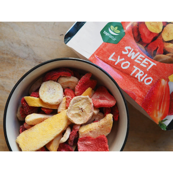 Sweet Lyo Trio ist eine sorgfältig zusammengestellte Mischung aus gefriergetrockneten Erdbeeren, Mango und Banane – Früchte, die dank schonender Gefriertrocknung ihren natürlichen Geschmack, Duft und ihre Nährstoffe behalten haben.