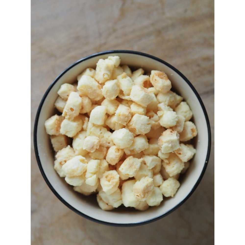 Die natürliche Farbe von Cheddar-Käse ist weiß, erst nach der Zugabe anderer Stoffe und Prozesse ändert sich die Farbe in Orange, deshalb bieten wir Ihnen diese Köstlichkeit in 100 % natürlicher Form