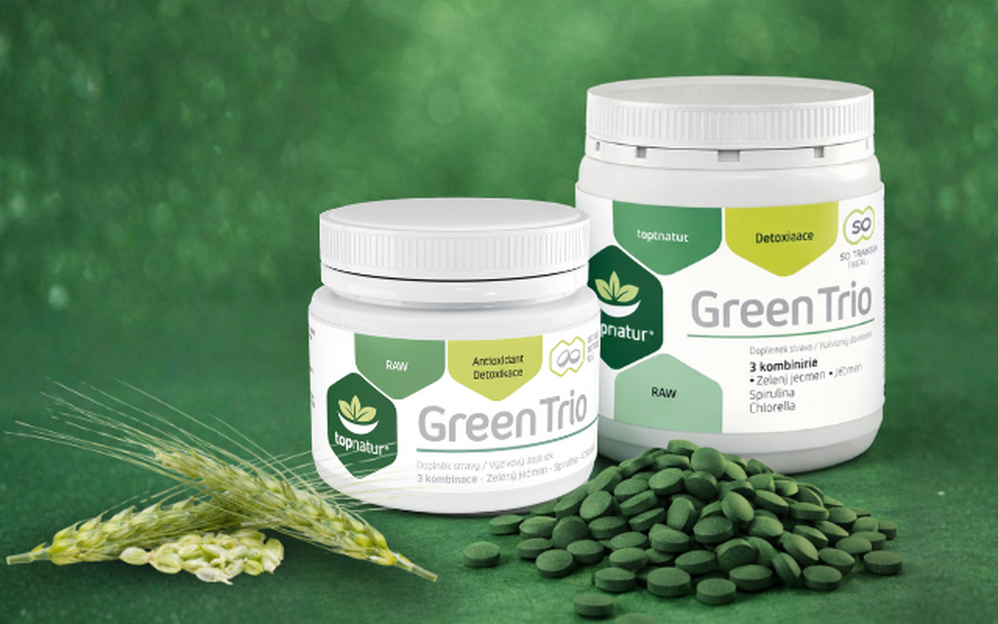 Green Trio TOPNATUR is a combination of 3 green superfoods chlorella, spirulina and green barley to support the body's immunity and defenses.