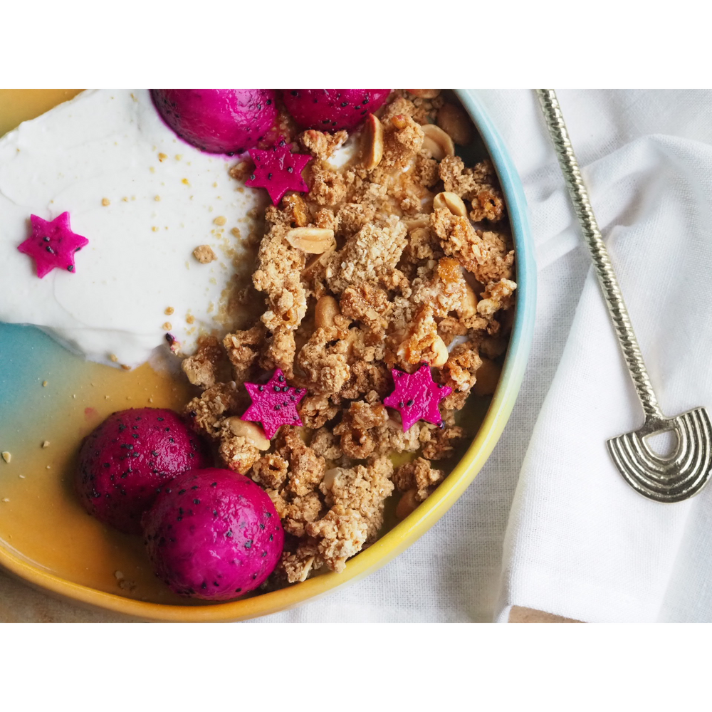 Gluten-free oatmeal, PEANUTS, honey, caramel pieces (sugar, glucose syrup, water, BUTTER, CREAM, salt, raising agent: baking soda), cocoa butter, ALMONDS, white chocolate with caramel [sugar, cocoa butter, caramel powder (dried skimmed MILK, sweet WHEY powder, sugar, BUTTER), sweet WHEY powder, skim milk powder, MILK fat, emulsifiers: sunflower and rapeseed lecithin, natural vanilla flavoring], sugar, flavoring, Himalayan salt