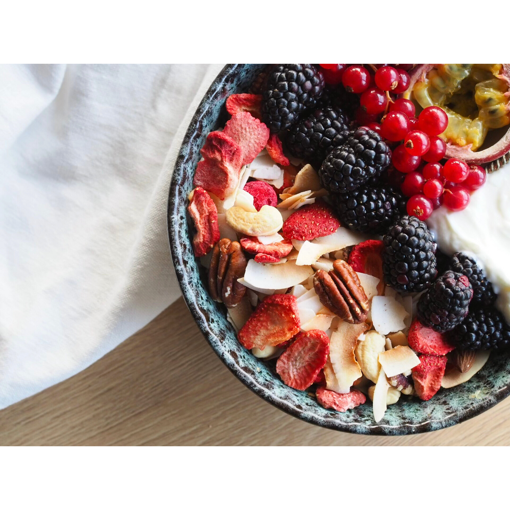 Loose mixture of pecans, almonds, hazelnuts, cashews, lyophilized fruit and coconut slices in a special edition LOW CARB.