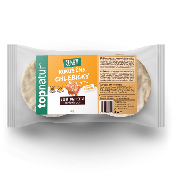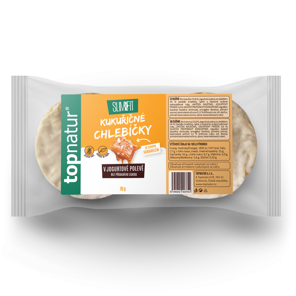 Crunchy corn cakes, a fiber-rich snack with a delicate yogurt coating without added sugar and a hint of salted caramel. A taste that will delight and satisfy.