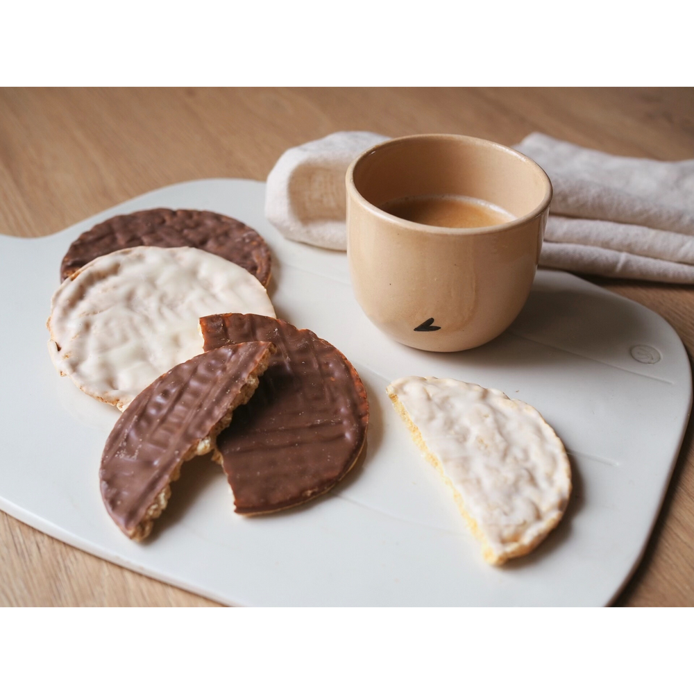 A snack full of fiber and sweet and salty flavors. Crispy corn cakes with a hint of caramel in a delicate milk and cocoa coating with no added sugar. Ideal for traveling and work.